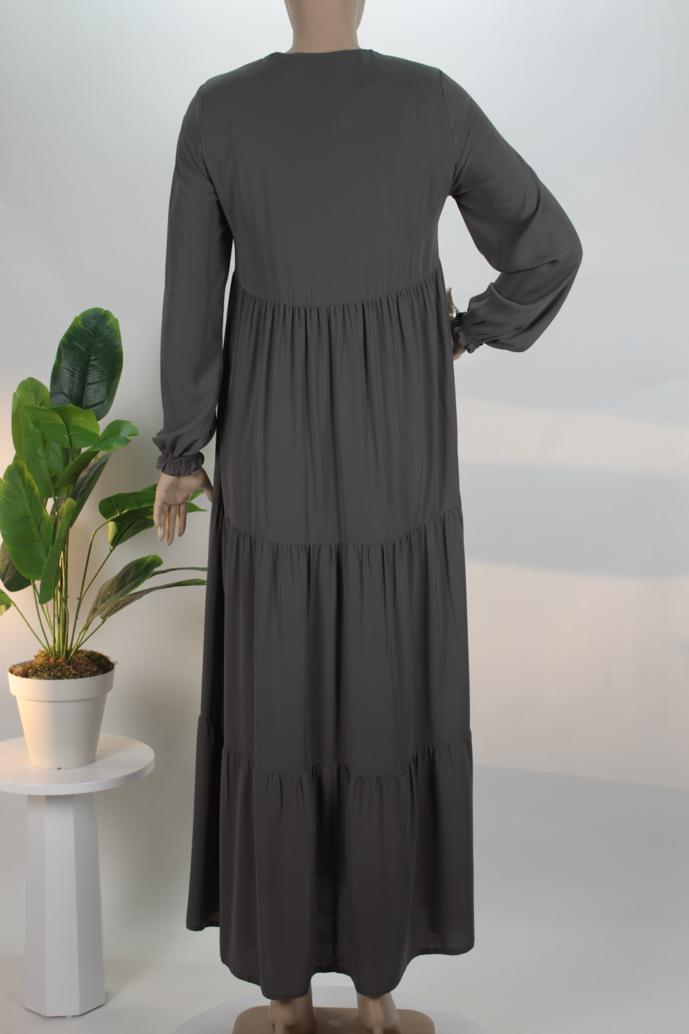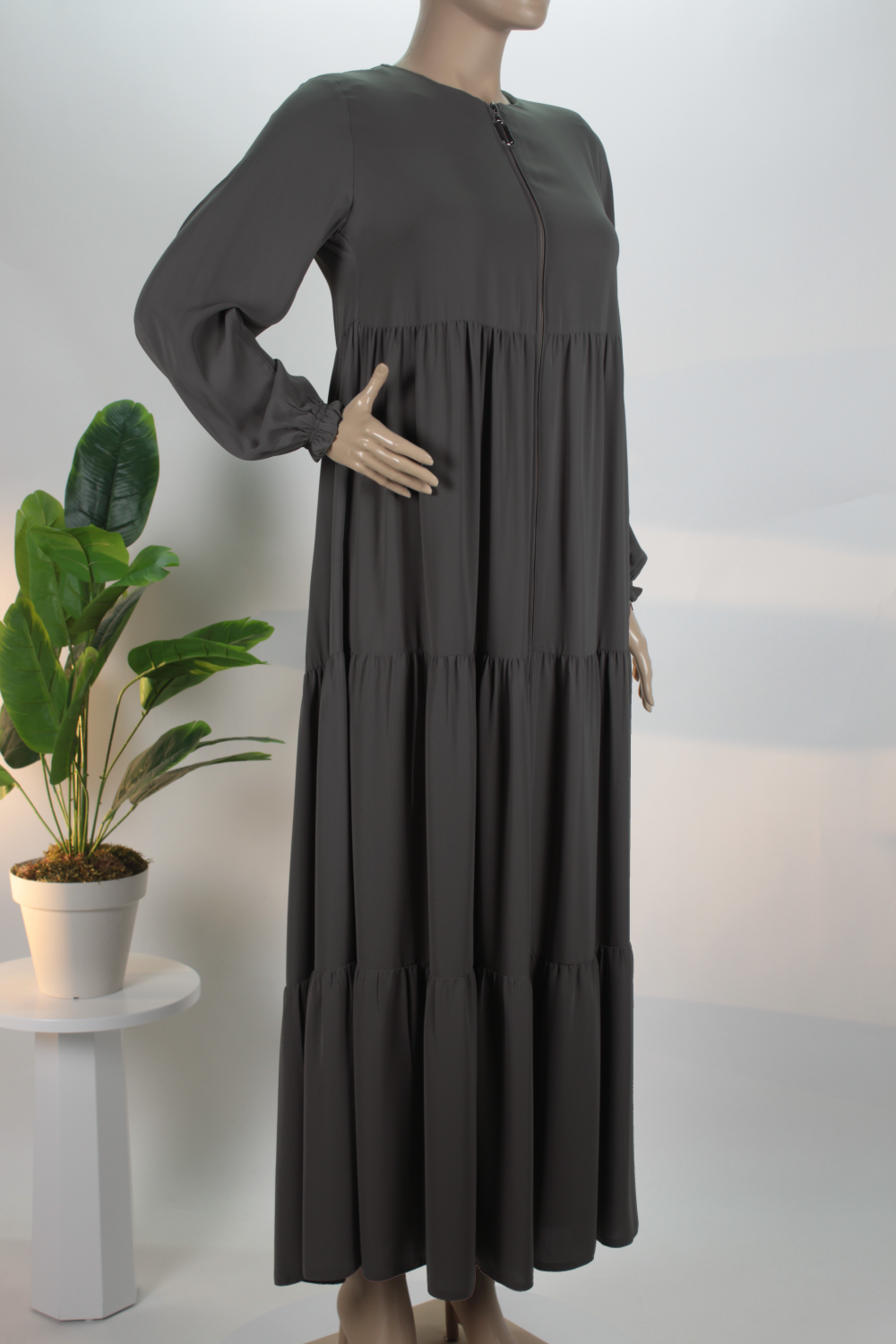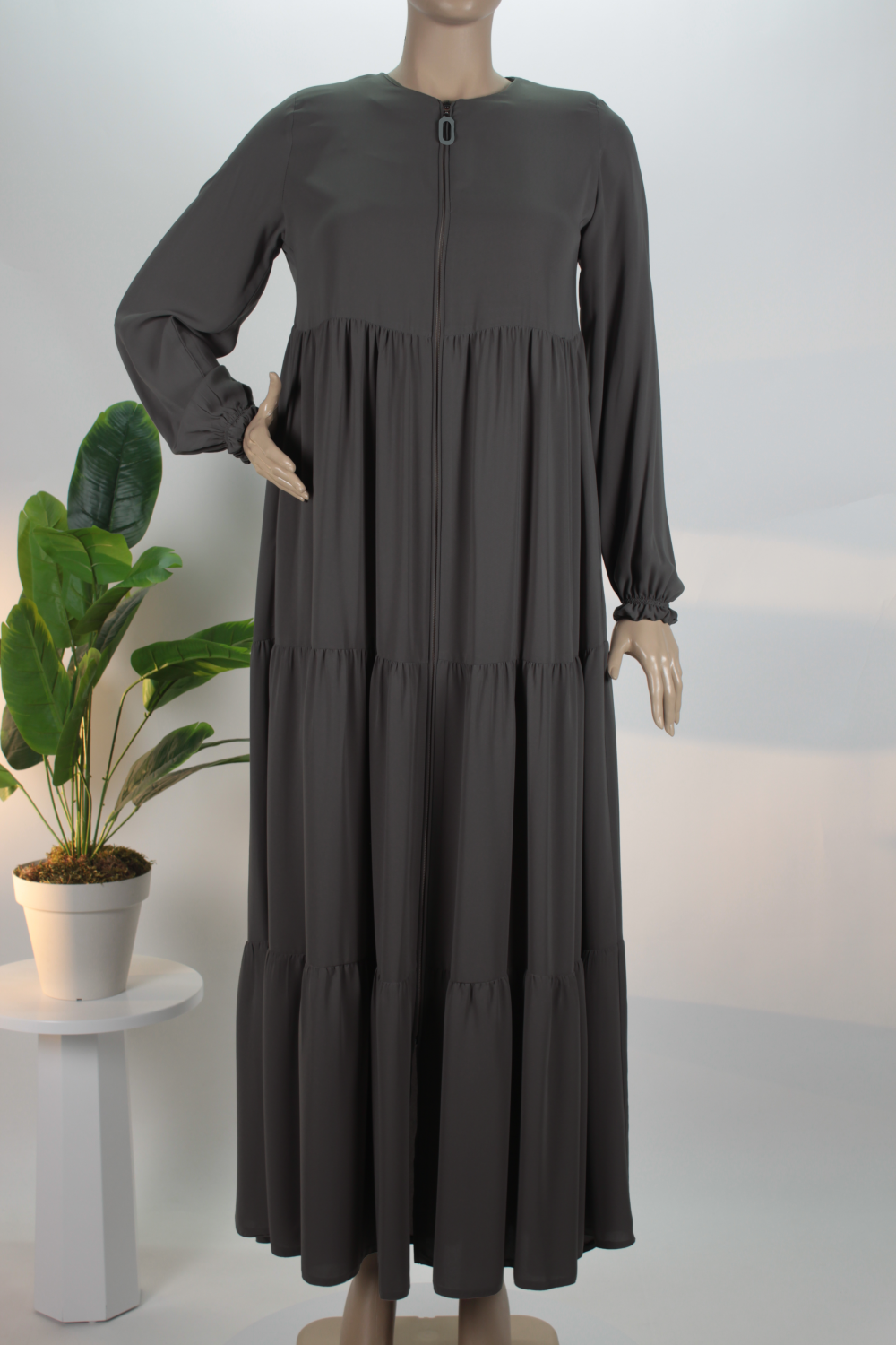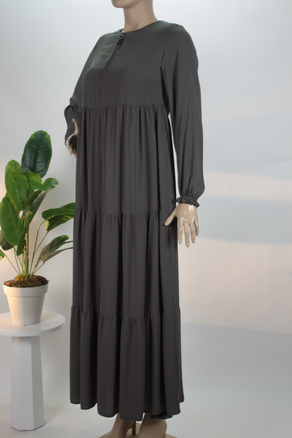 Üç Katlı Tasarım: Göğüs hizasının altından başlayan üç aşamalı katmanlı yapısı, feraceye zarif bir hacim kazandırır ve uçuş uçuş bir görünüm sunar.