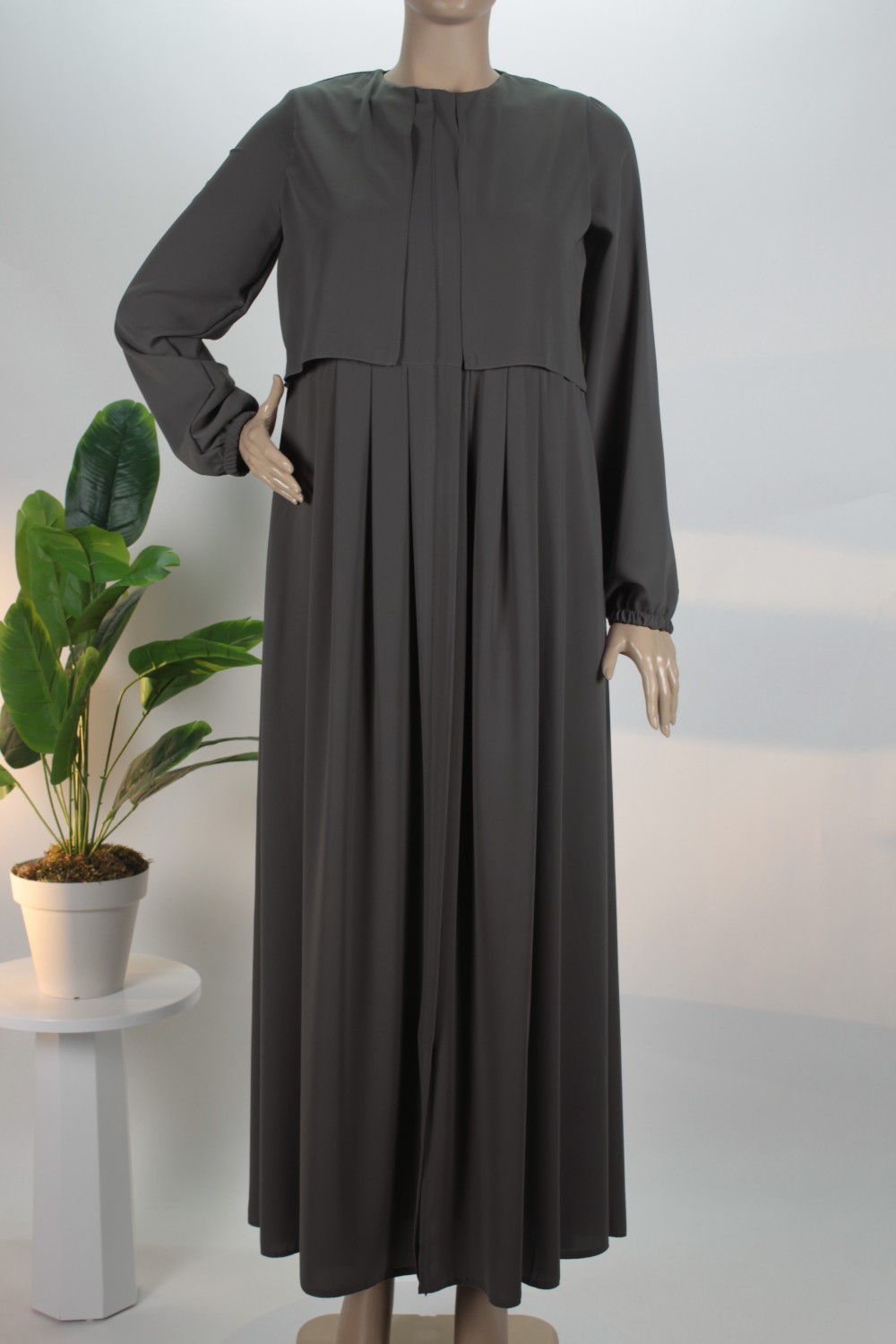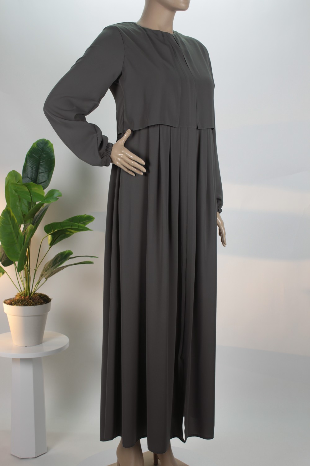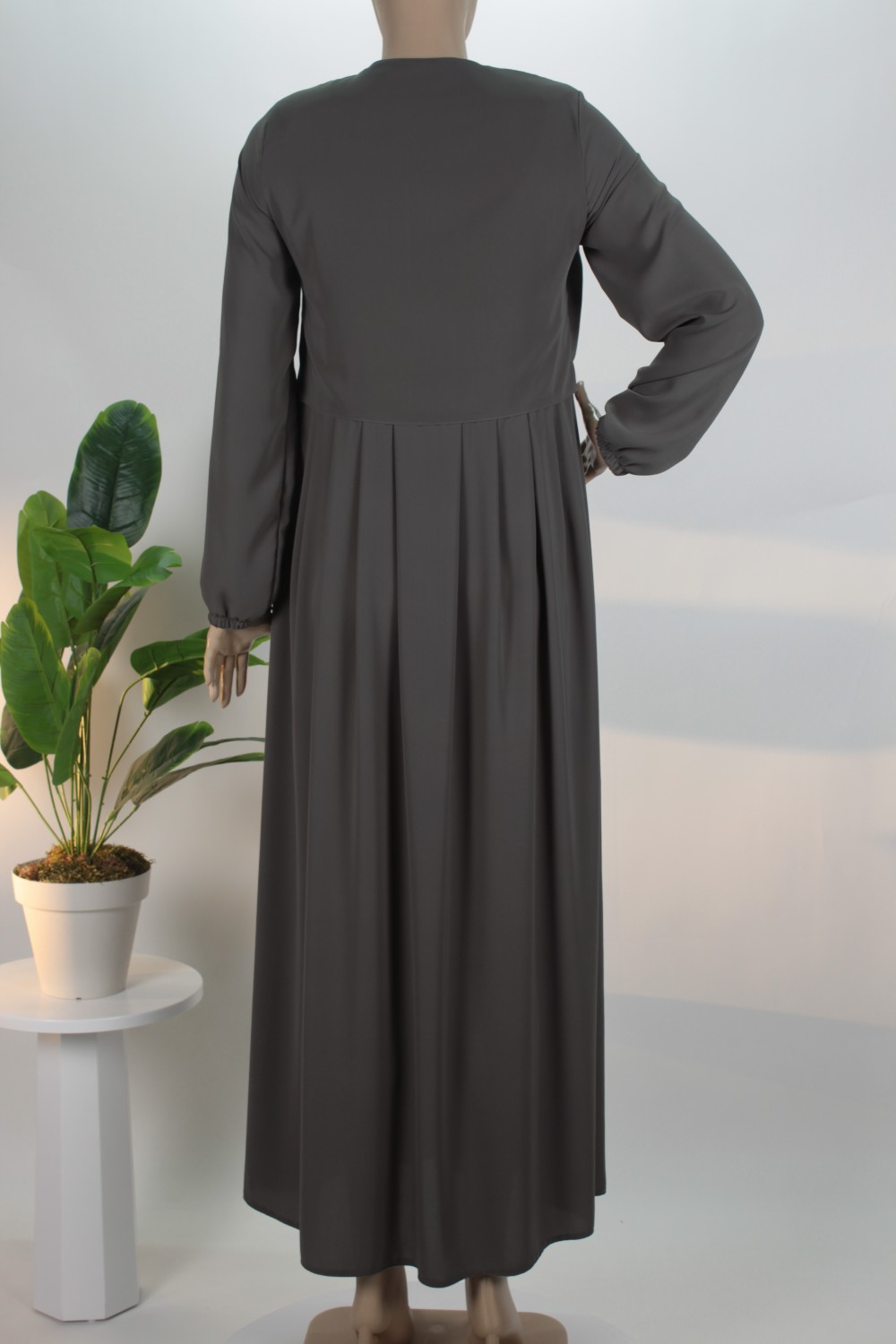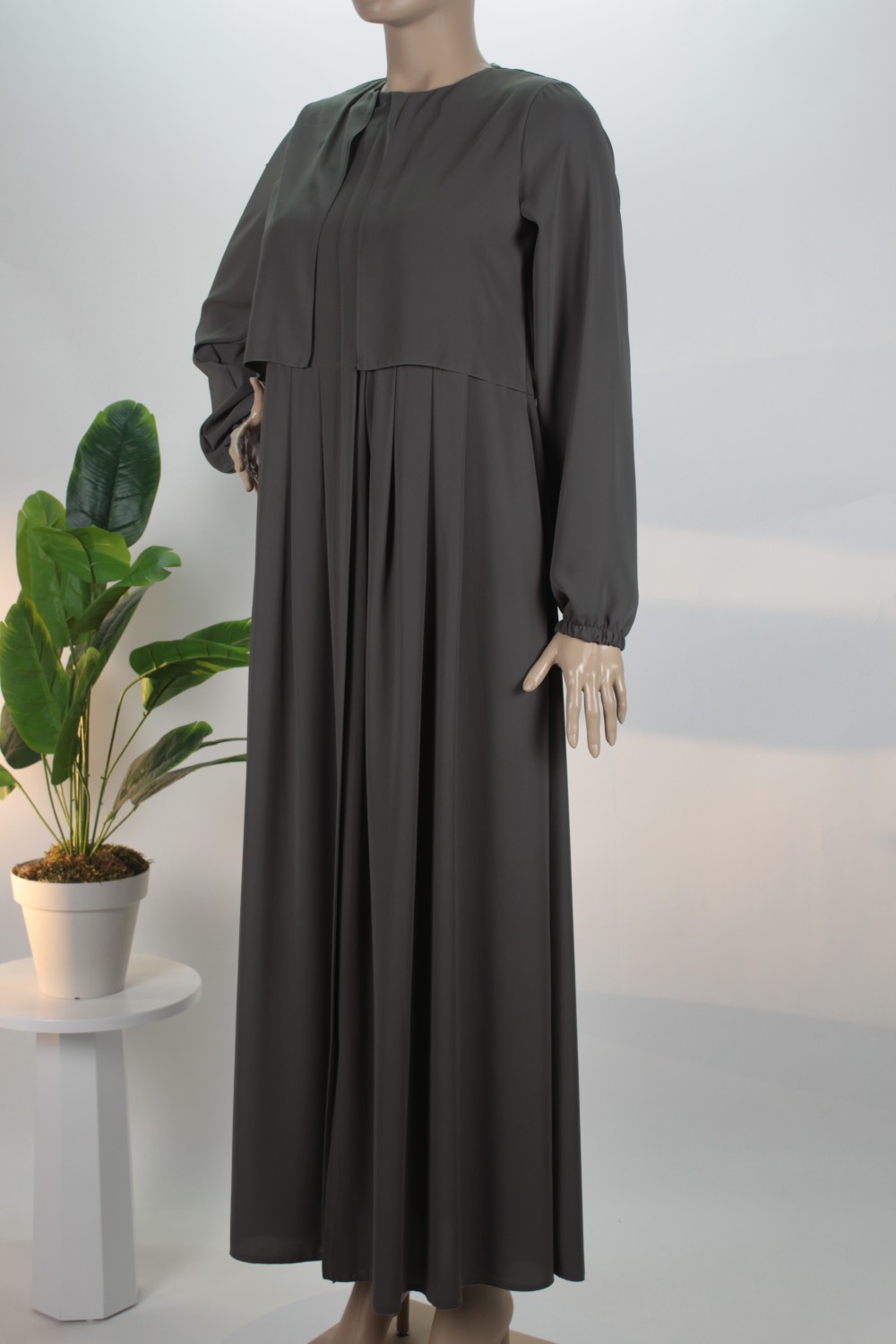 Gövde kısmındaki zarif pilelerle hareket kazanan bu model, boydan boya uzanan gizli patlı tasarımı sayesinde sade ve pürüzsüz bir silüet sergiler. Bilekleri nazikçe kavrayan manşetleri ve salaş kesimiyle hem günlük yaşamda hem de özel davetlerde muhafazakar çizgiden ödün vermeden şıklığı yakalamak isteyen kadınlar için ideal bir tercihtir.