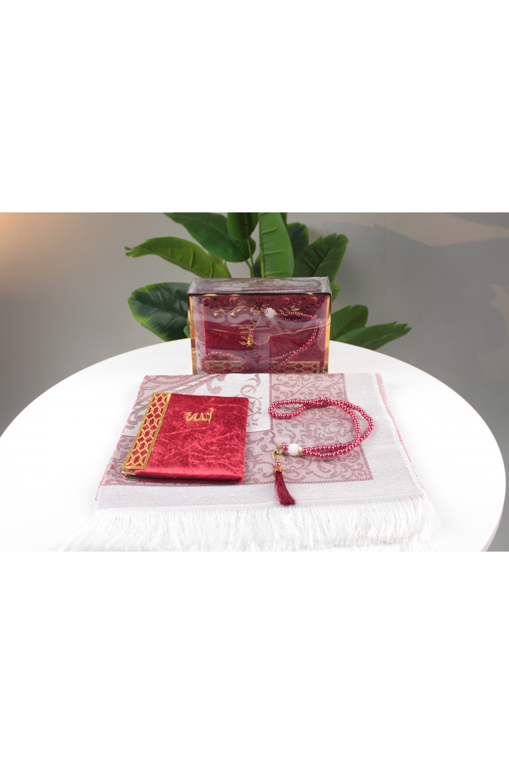 Set İçeriği: Bir adet lüks desenli seccade, bir adet 99’luk inci görünümlü tesbih ve bir adet kadife kaplı Yasin-i Şerif kitabı olmak üzere 3 parçadan oluşur.