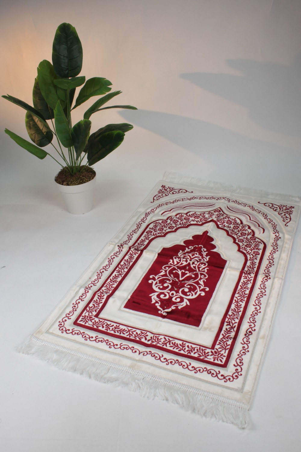 Didem Serisi Estetiği: Beyaz ve mürdüm tonlarının eşsiz uyumuyla tasarlanan, floral motifli özel mihrap desenine sahiptir.