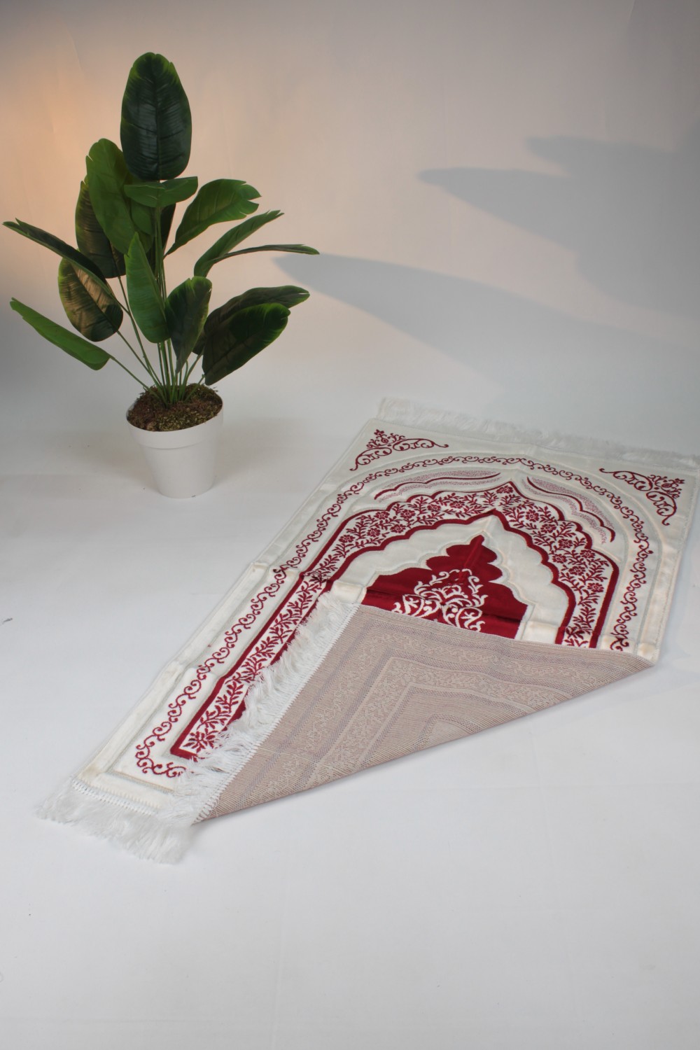 Zarif Saçak Detayları: Seccadenin tasarımını tamamlayan, dökülmeye karşı dirençli şık beyaz saçaklara sahiptir.