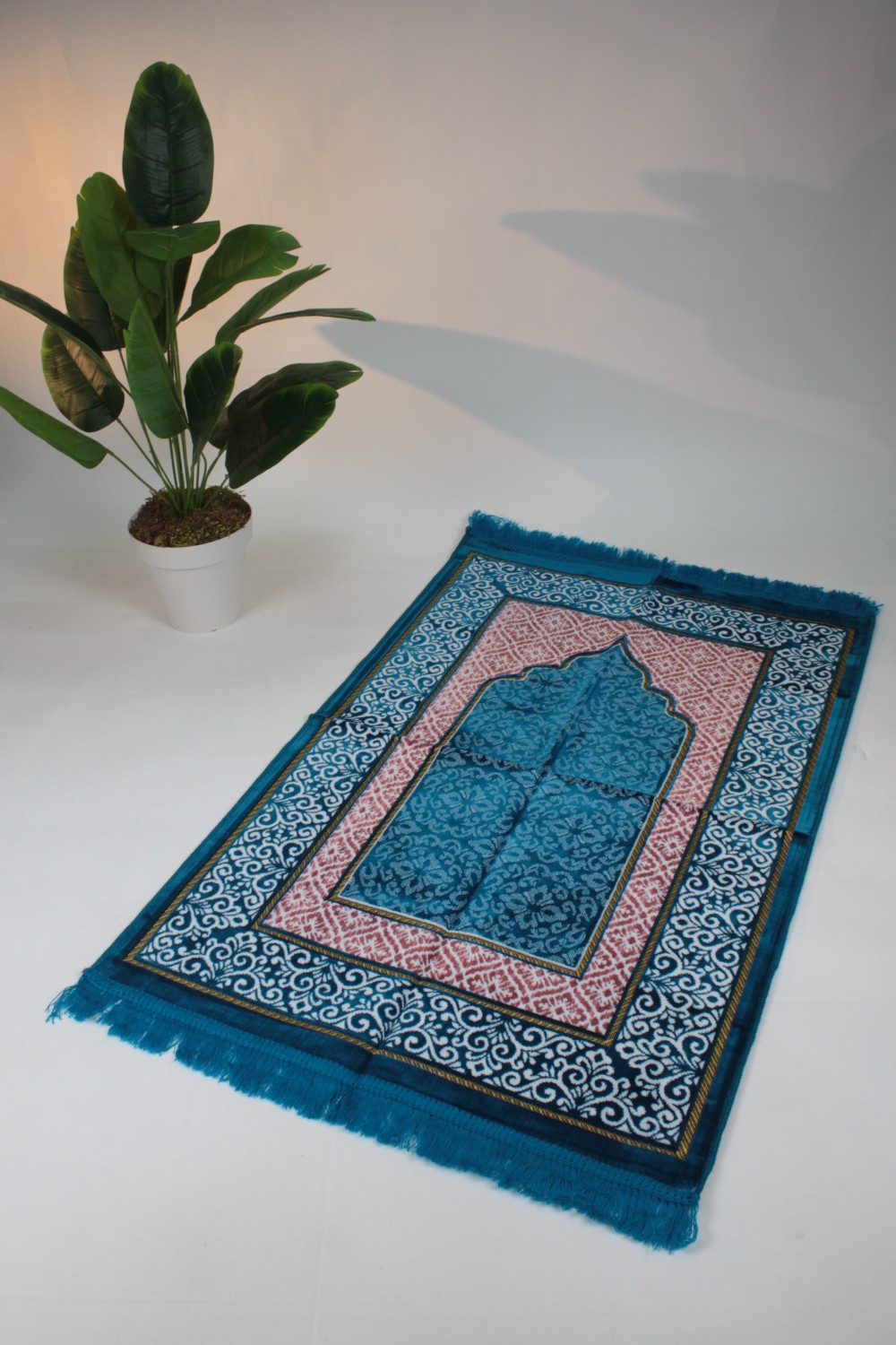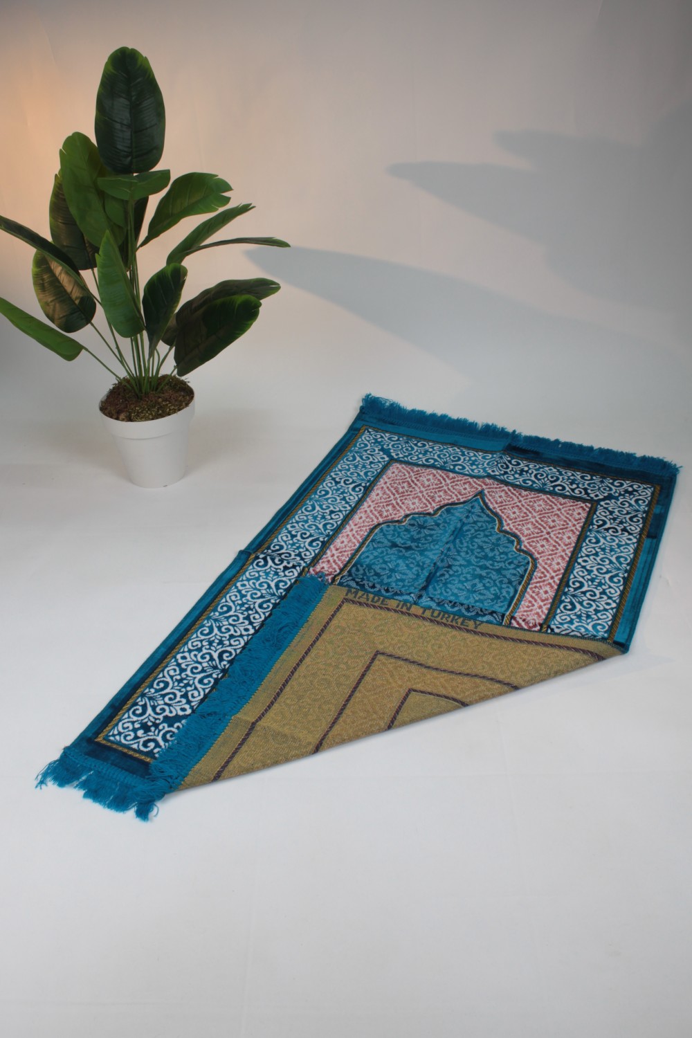 Lüks Kadife Doku: Birinci sınıf kadife ipliklerden dokunmuştur; parlak görünümü ve yumuşak yüzeyi ile konforlu bir ibadet deneyimi sağlar.
