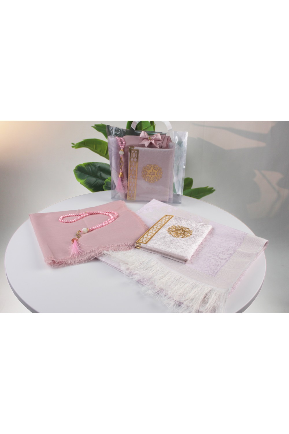 Kendine özel, kulplu şeffaf çantası sayesinde paketleme zahmetini ortadan kaldıran bu set, hem toplu hediye dağıtımları için pratik bir çözüm sunar hem de muhafazası kolaydır. Altın yaldız detayları ve birbiriyle uyumlu motifleriyle, sevdiklerinizin her ibadetinde sizi hatırlatacak kalıcı ve bereketli bir hediyeliktir.