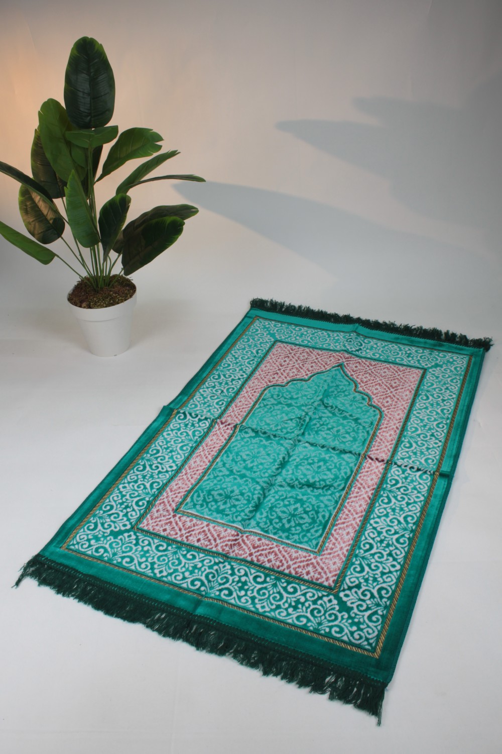 Lüks Kadife Doku: Birinci sınıf kadife ipliklerden dokunmuştur; parlak görünümü ve yumuşak yüzeyi ile konforlu bir ibadet deneyimi sağlar.