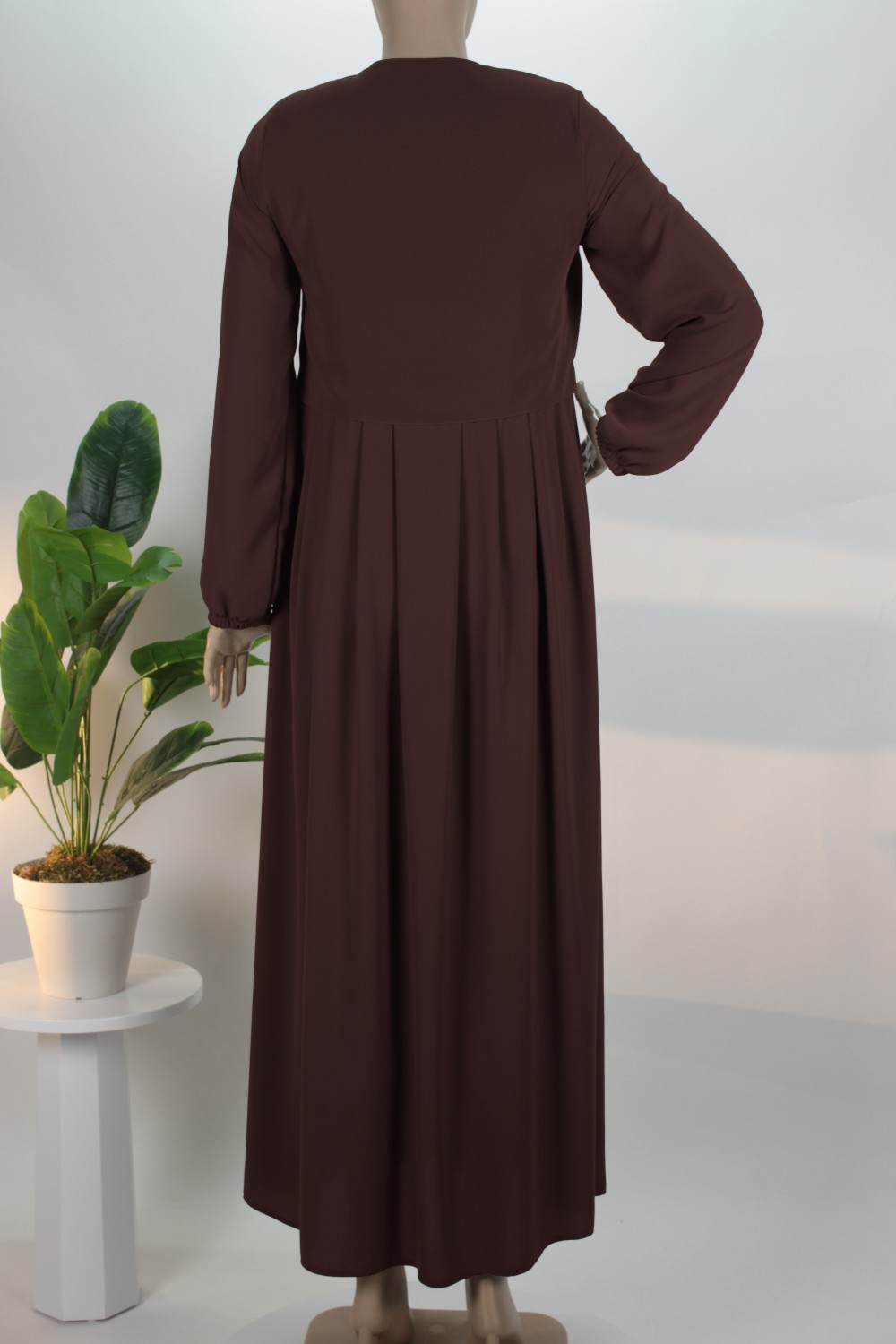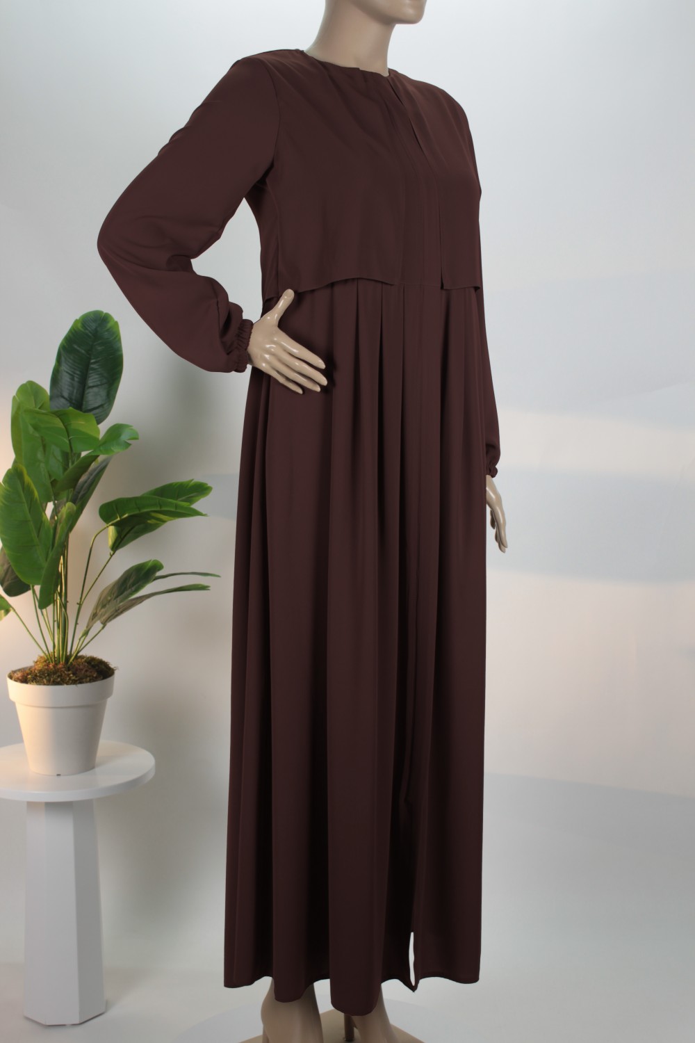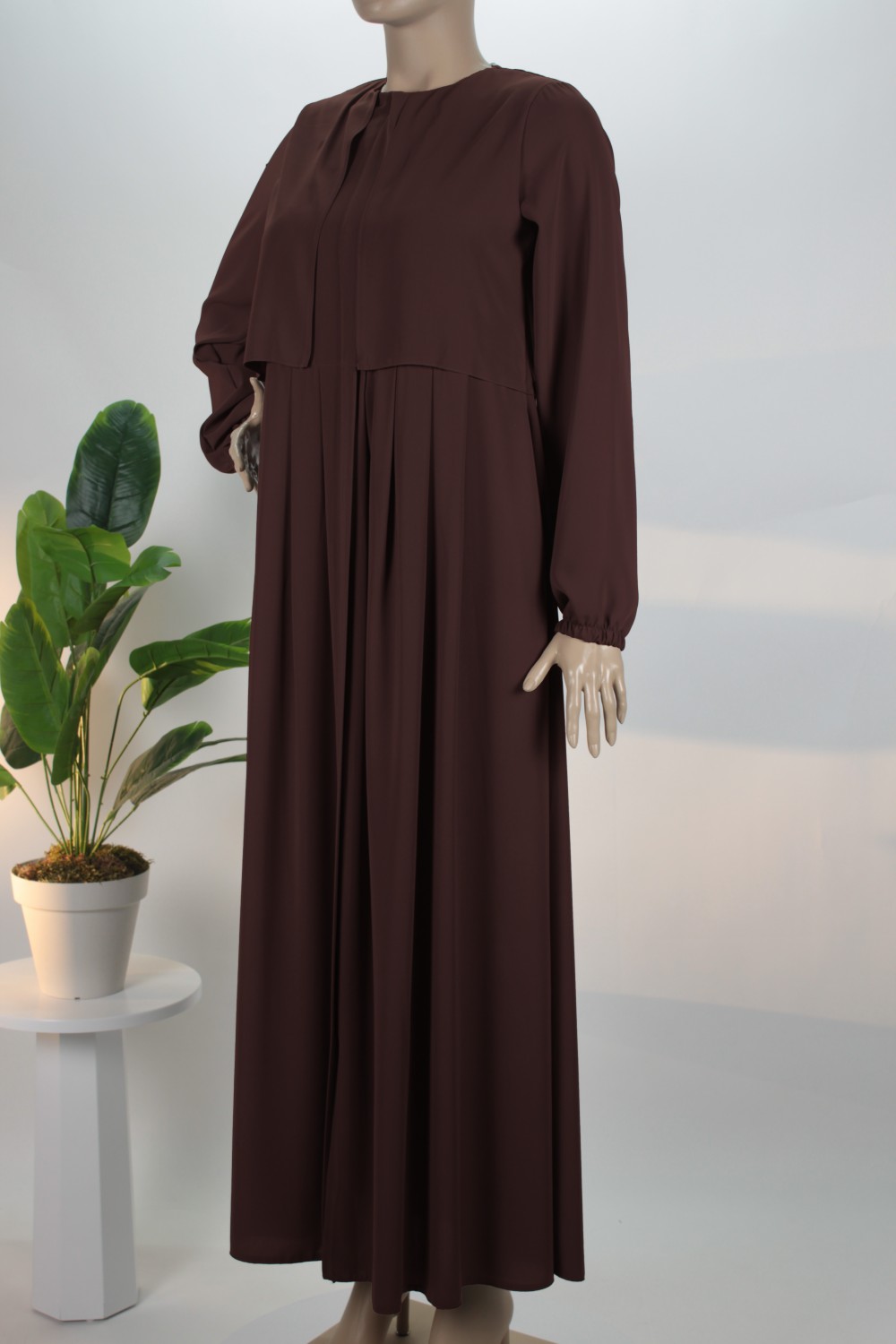 Gövde kısmındaki zarif pilelerle hareket kazanan bu model, boydan boya uzanan gizli patlı tasarımı sayesinde sade ve pürüzsüz bir silüet sergiler. Bilekleri nazikçe kavrayan manşetleri ve salaş kesimiyle hem günlük yaşamda hem de özel davetlerde muhafazakar çizgiden ödün vermeden şıklığı yakalamak isteyen kadınlar için ideal bir tercihtir.