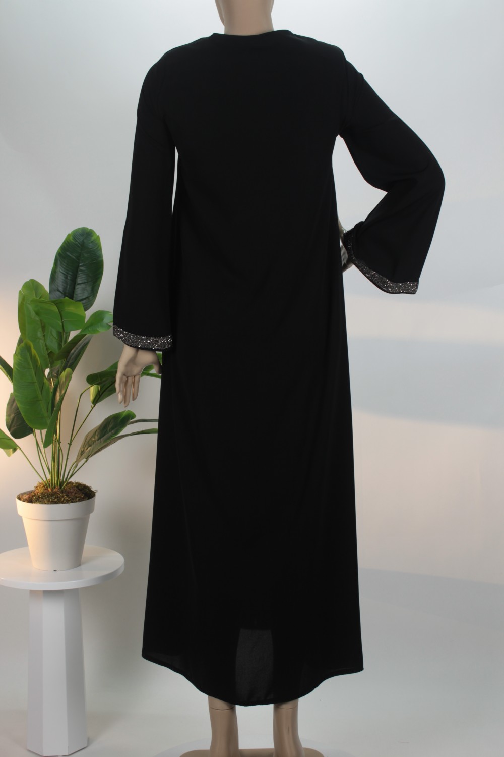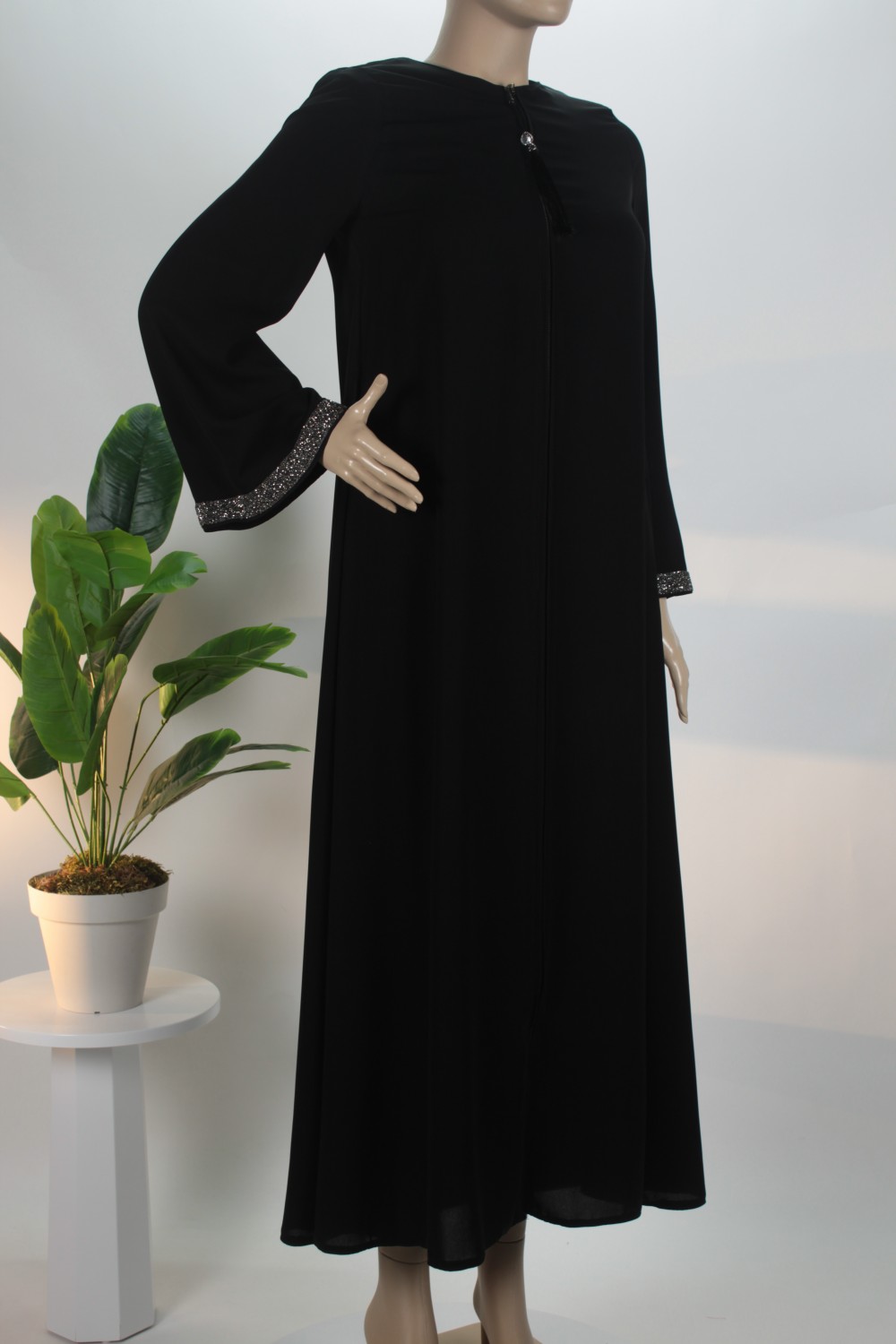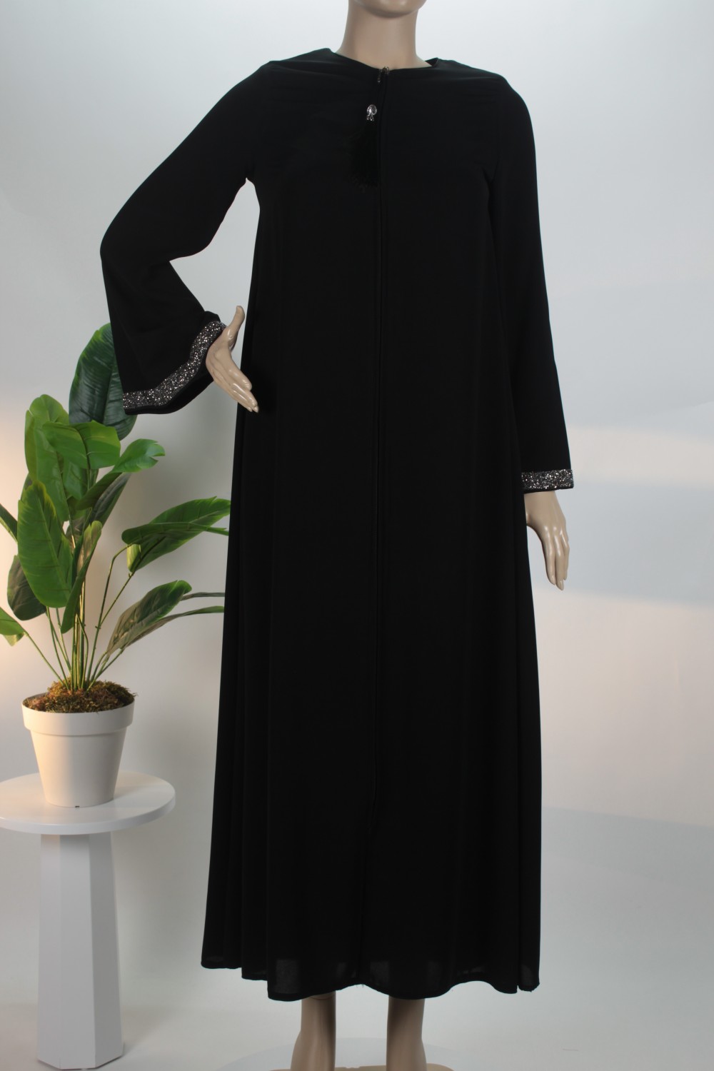 Siyah Kol Ucu Taşlı Medine İpeği Ferace