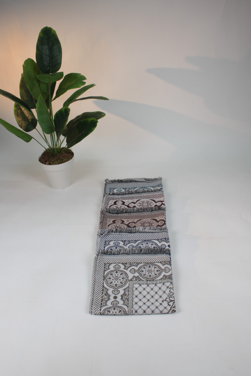 Geleneksel goblen dokuma sanatını modern bir ışıltıyla buluşturan Simli Goblen Seccade, ibadet anlarınıza zarafet katmak için tasarlandı. Sık dokunmuş goblen kumaşın sağladığı tok duruş, üzerindeki ince simli iplik işlemeleriyle birleşerek göz alıcı bir estetik sunar. Klasik mihrap deseninin floral (çiçeksi) motiflerle harmanlandığı bu model, pastel tonlardaki renk geçişleriyle her türlü dekorasyona asil bir uyum sağlar.
