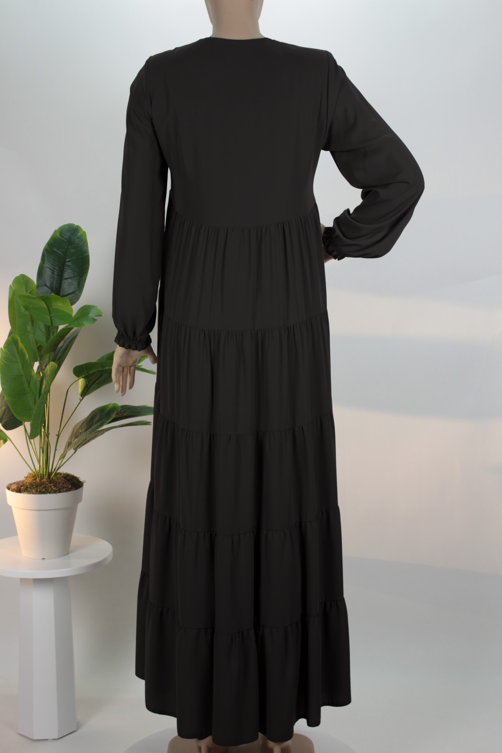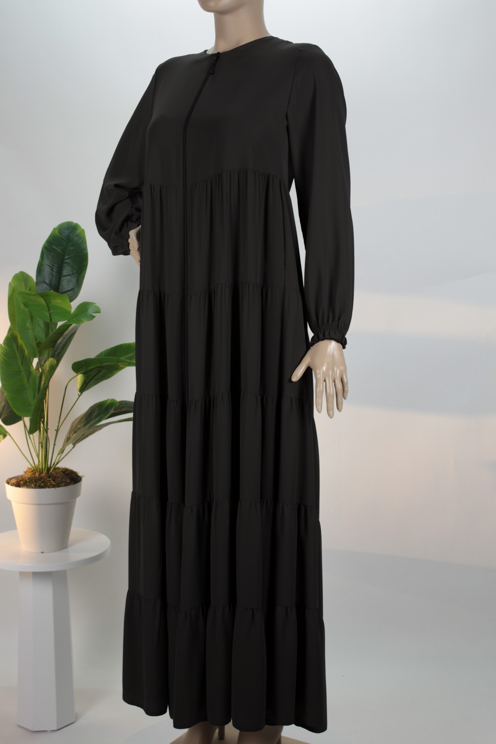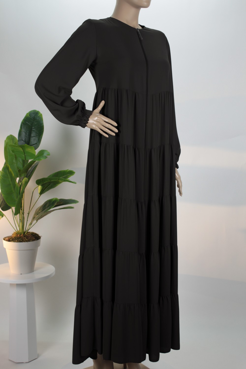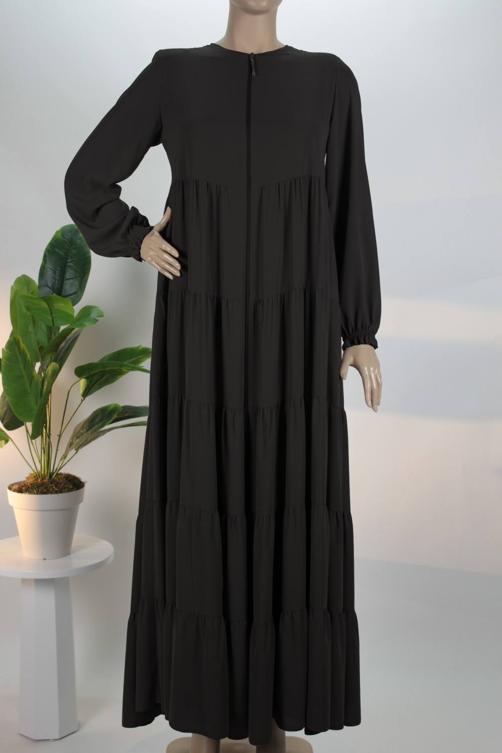 Beş Katlı Tasarım: Gövdeden itibaren başlayan beş aşamalı katlı kesim, feraceye modern bir form kazandırırken ekstra örtücülük sağlar.