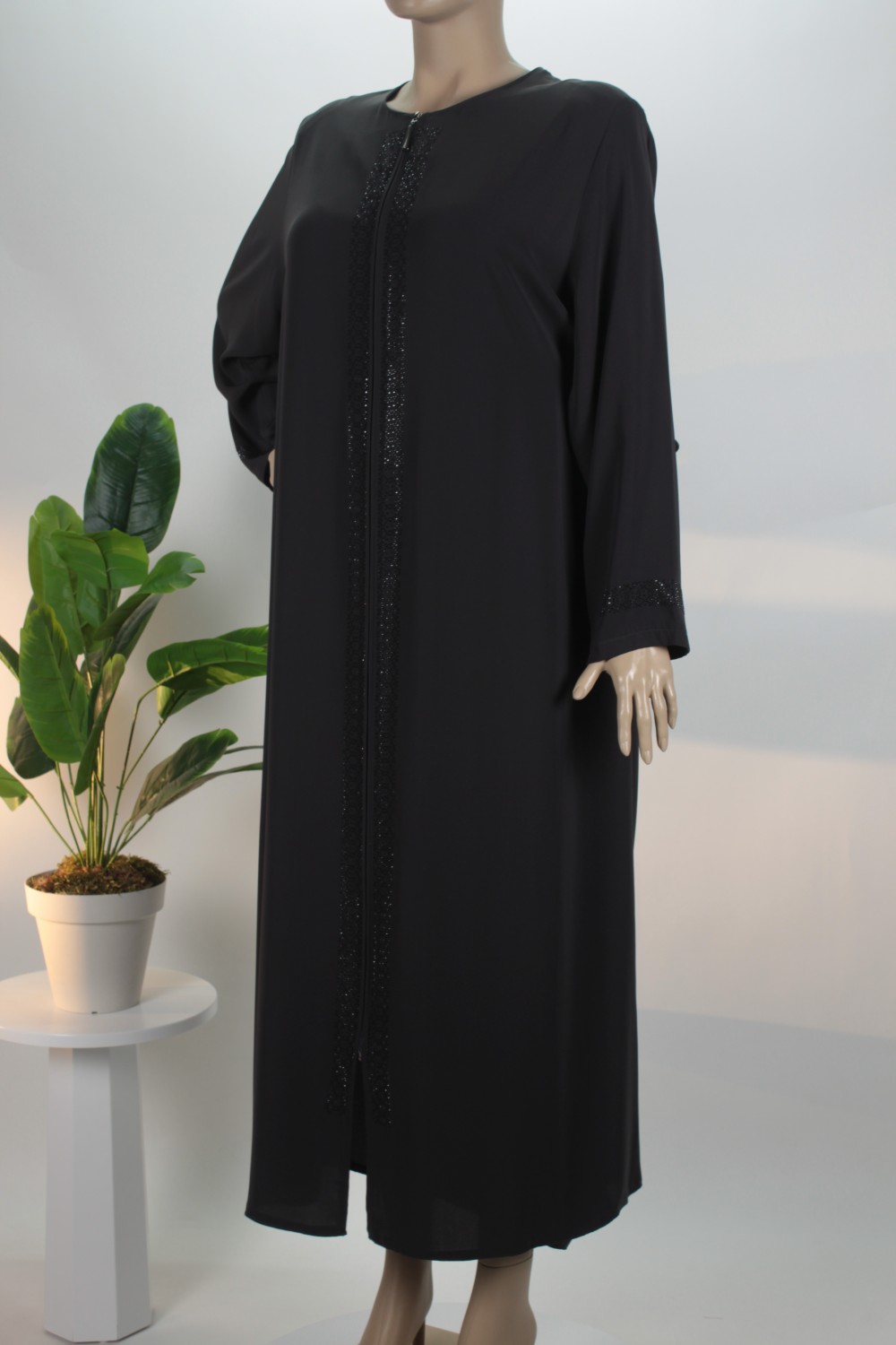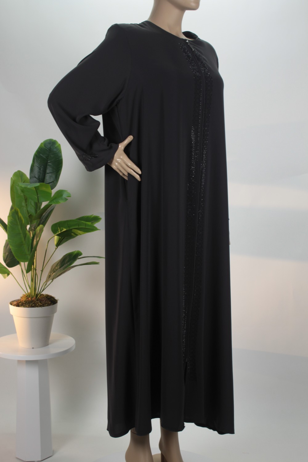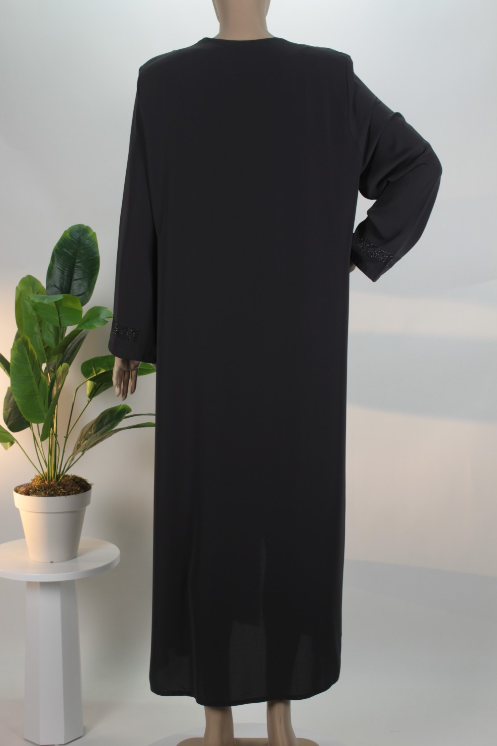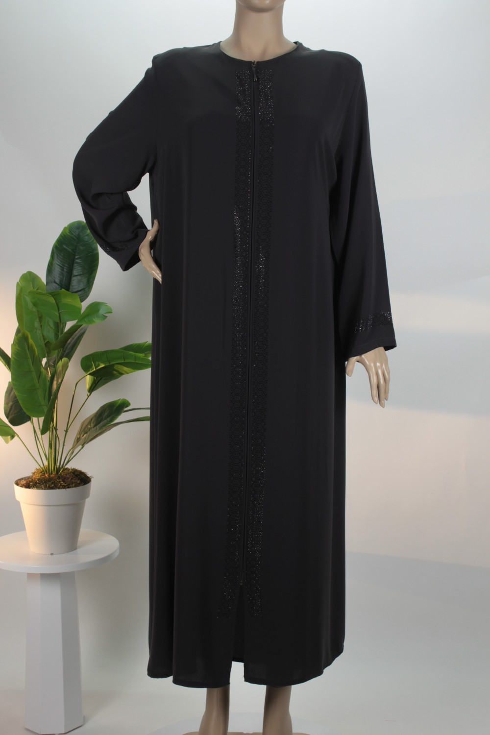 Taş Şerit Detayı: Ön orta kısımda yer alan boydan boya taş işlemeli şerit, feraceye modern ve asil bir ışıltı katar.